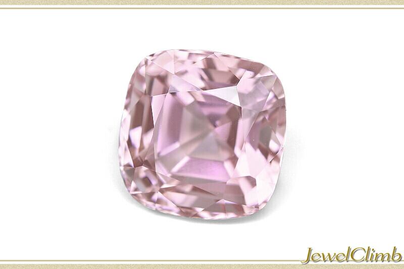 ふっくらとした優しい印象を与えるクッションカットが施されパステルピンクの色彩とスタイルが調和している 魅力溢れる結晶です。