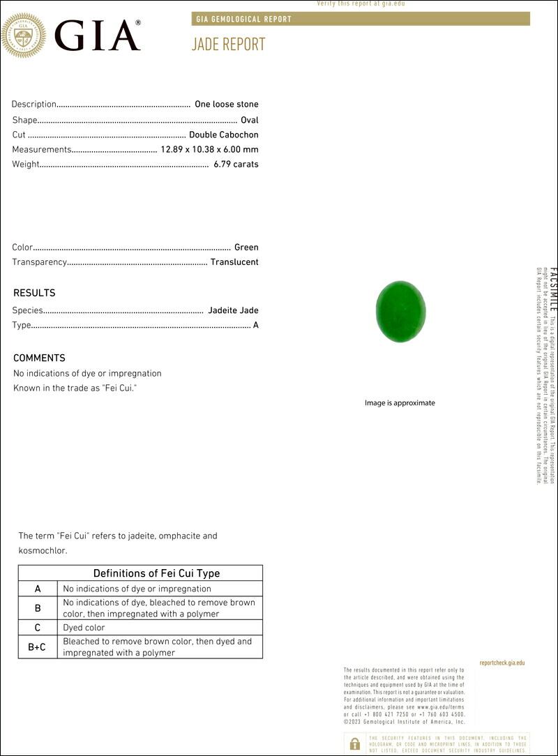 ◇宝石 グリーンジェダイト(本翡翠) ◇重量 6.79CT ◇形状 オーバルカボション ◇寸法 12.89x10.38x6.00mm ◇ 産地 ミャンマー ◇硬度 6.5〜7 ◇品質 VS ◇色相 −− ◇備考 GIAルース鑑別書付き ◇『カラーストーンの品質と色相の表記について』