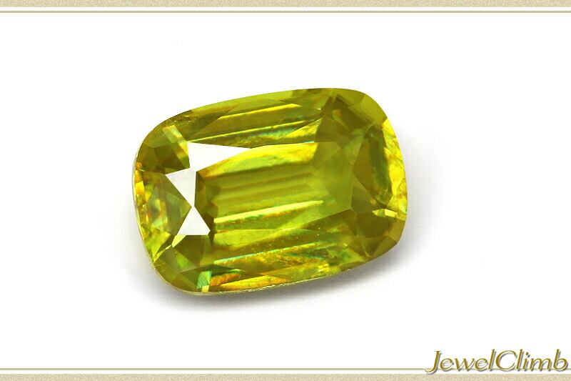 3CTを超える結晶は形の美しいクッションカットが施され、結晶表面はエッジの効いた光の反射を魅せておりスフェーン独特の魅力であるファイアを存分に放つ煌きの優れた一石です。