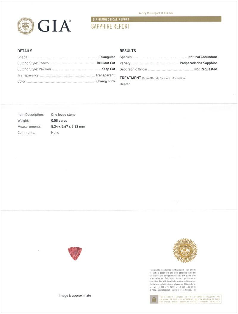 GIAルース鑑別書付きで「Padparadscha Sapphire」との明記もございますのでご安心くださいませ。
