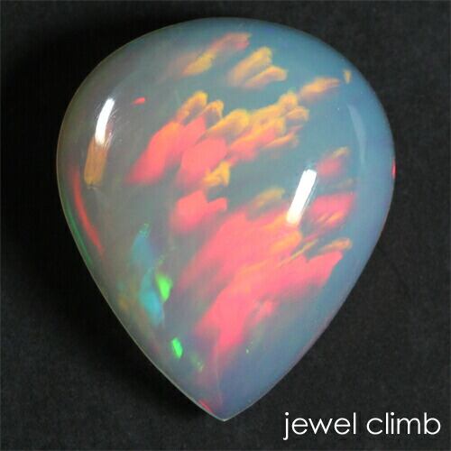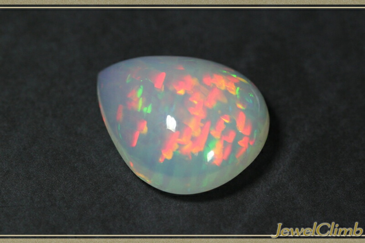 オパールはオーバルカボションに磨かれることが多い宝石ですがふっくらしたペアシェイプカボションに施され光沢感ある表情が美しい一石です。