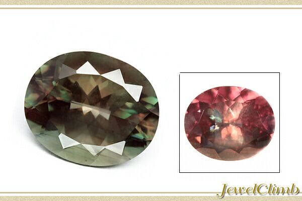 クラシカルな雰囲気も感じさせるビリジアングリーンが大人びたレッド系カラーに変化する様子はカラーチェンジする宝石の中でも異彩な美しさと言えます。