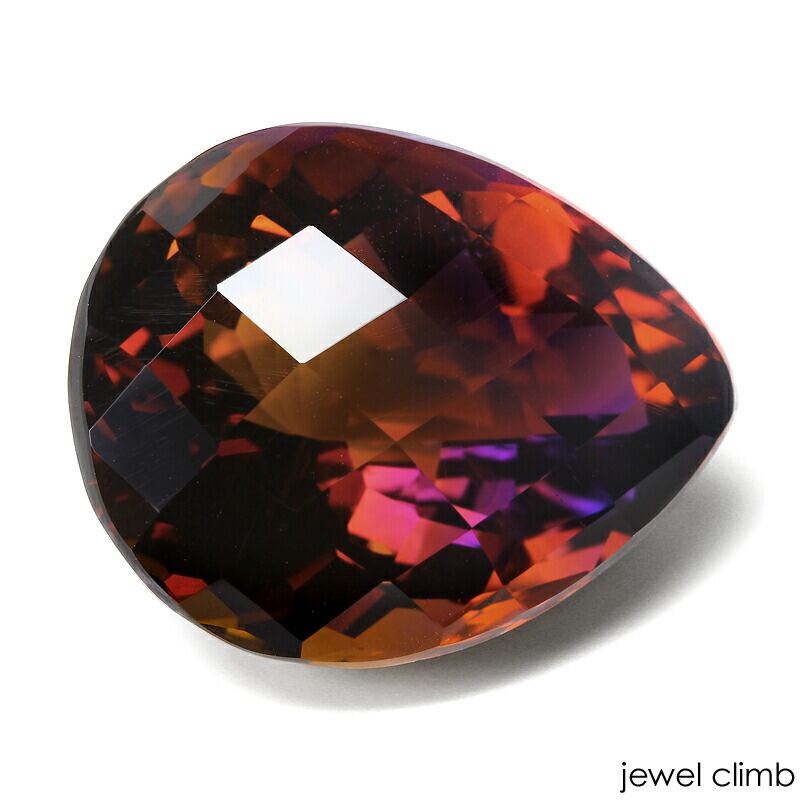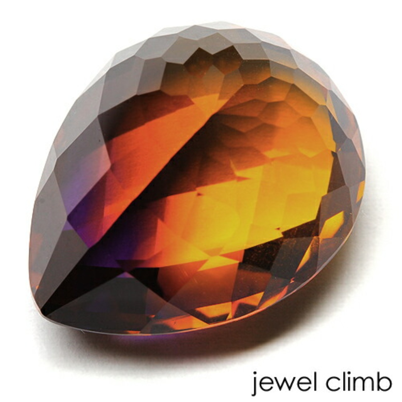 アメトリンのようなバイカラーストーンは色の違いをできる限りはっきりと視認できるように通常ステップカットやバケットカットを施すことが多いのですがこちらはそのような常識を覆したペアシェイプカット。