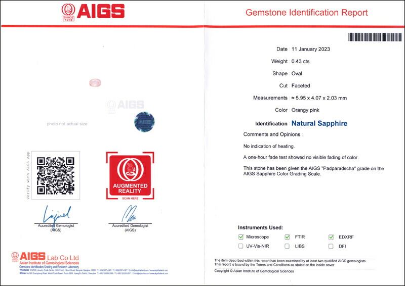 パパラチャである事、加熱が行われていない事、記載の入ったAIGS鑑別書を一緒にお届け致します。