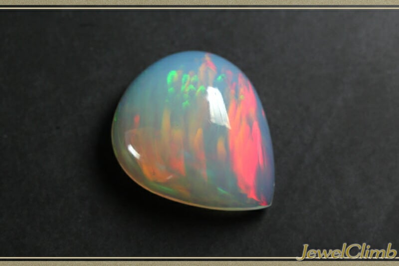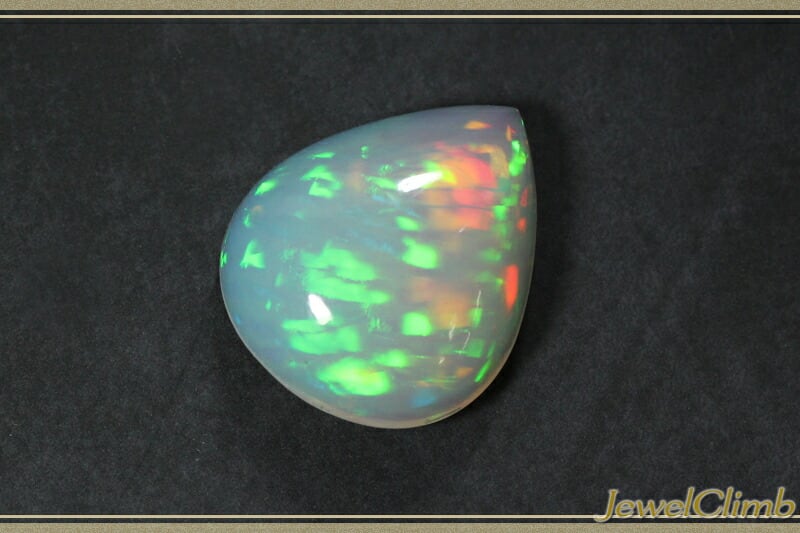 オパールはオーバルカボションに磨かれることが多い宝石ですがふっくらしたペアシェイプカボションに施され光沢感ある表情が美しい一石です。