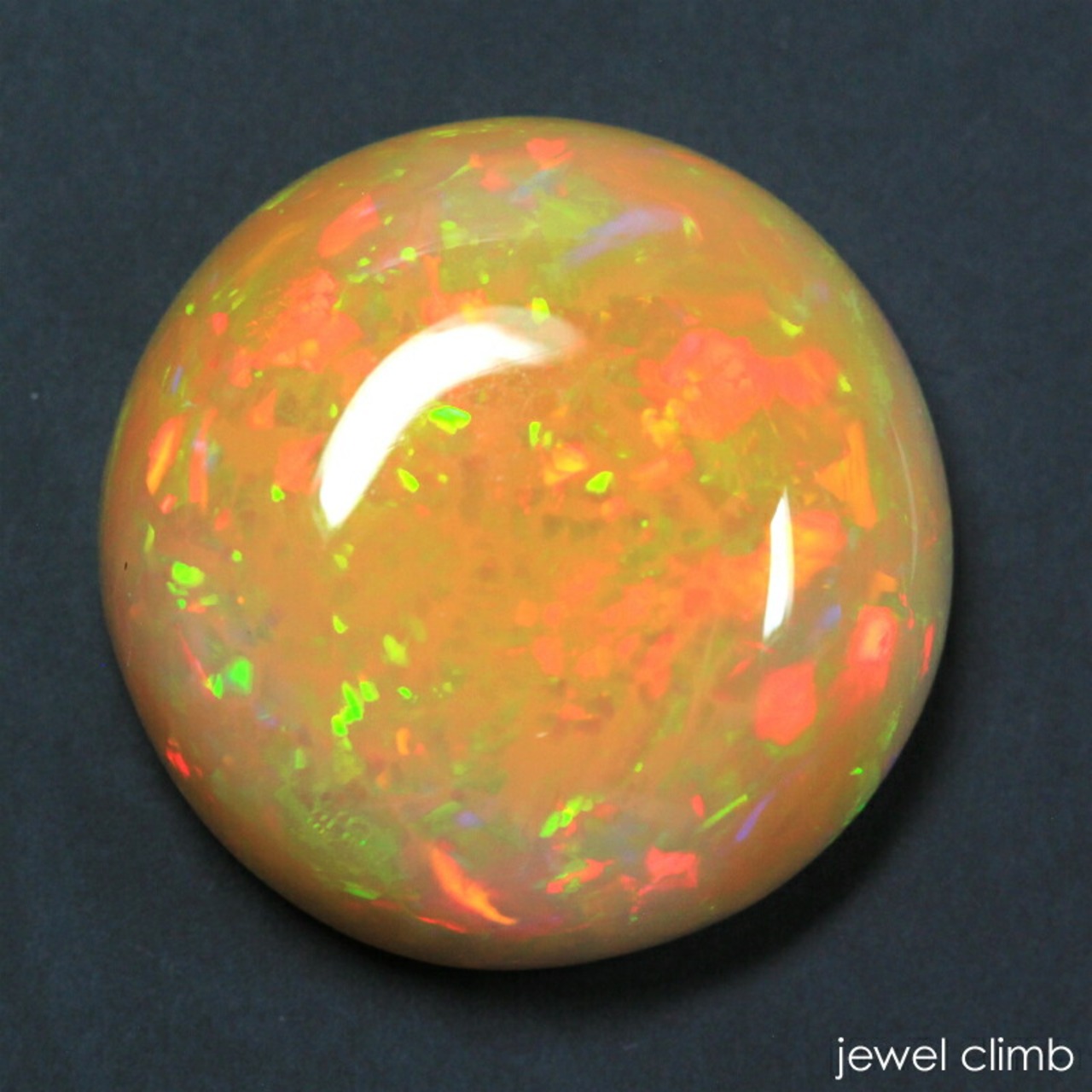 おちついたオレンジカラーを地色としネオンオレンジ、オレンジレッド、グリーン、イエローの遊色が美しく放たれるクリスタルオパール。